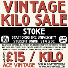 Ace Vintage will be hosting a Kilo Sale at the Staffordshire University Student Union that will feature vintage clothing for just £15 per kilo. There will be fleece, sweaters, jackets, tees, and jeans.