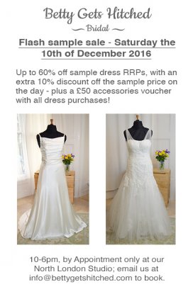 Calling all brides - flash sample sale alert SATURDAY 10TH DECEMBER 2016! This is our LAST sample sale of the year, so if you'd like to have your wedding dress all wrapped up before Christmas then this is the perfect opportunity. With up to 60% off all RRPs plus an EXTRA 10% off on the day, we are also giving all brides who find their dress a £50 accessories voucher to use up until their first fitting. We have limited appointments available from 10-6pm, email info@bettygetshitched.com to book your appointment with us. It's not to be missed!