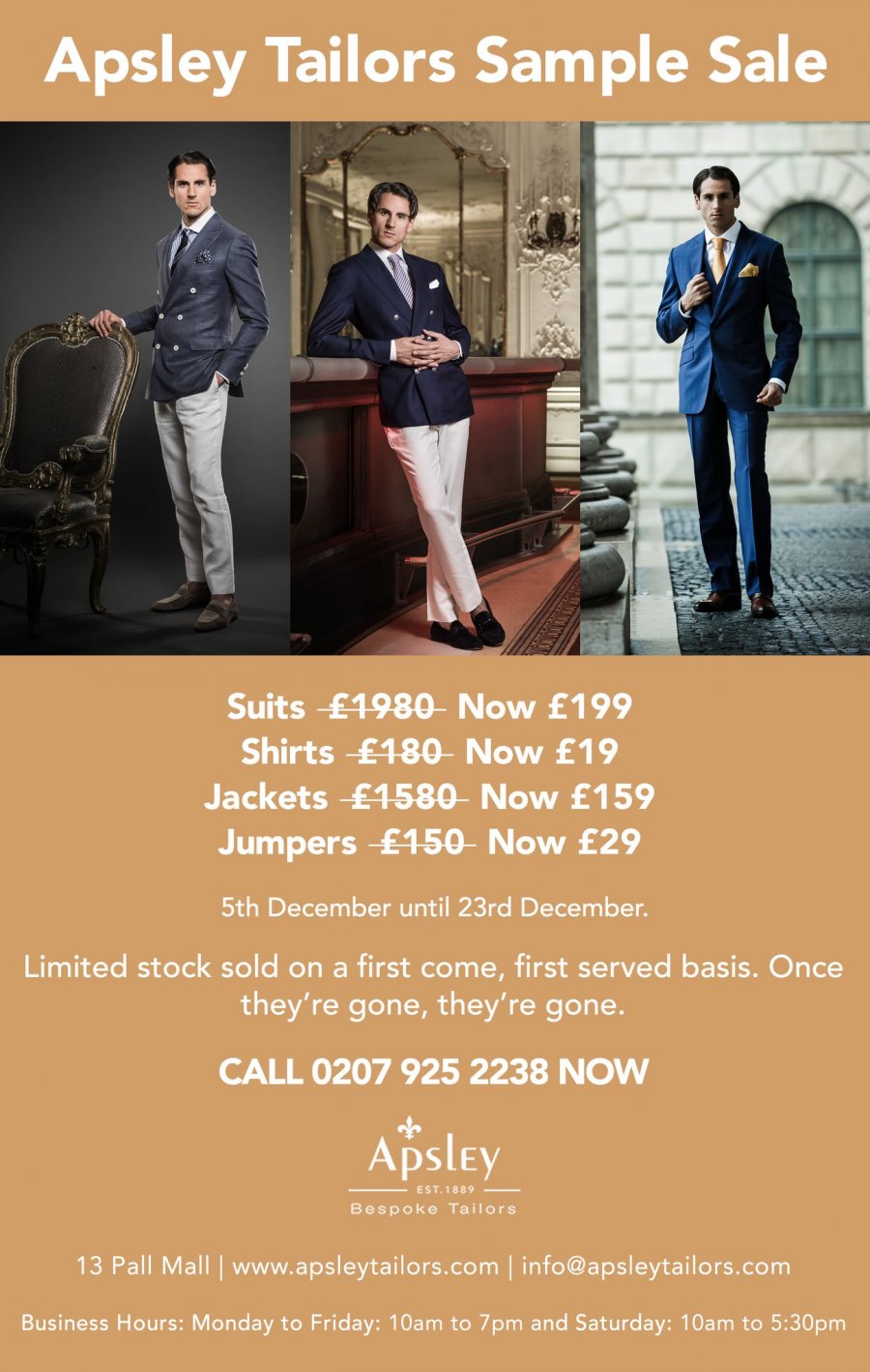 Apsley Tailors Sample Sale. Suits from £199 - shirts from £19 - jackets from £159 - jumpers from £29.