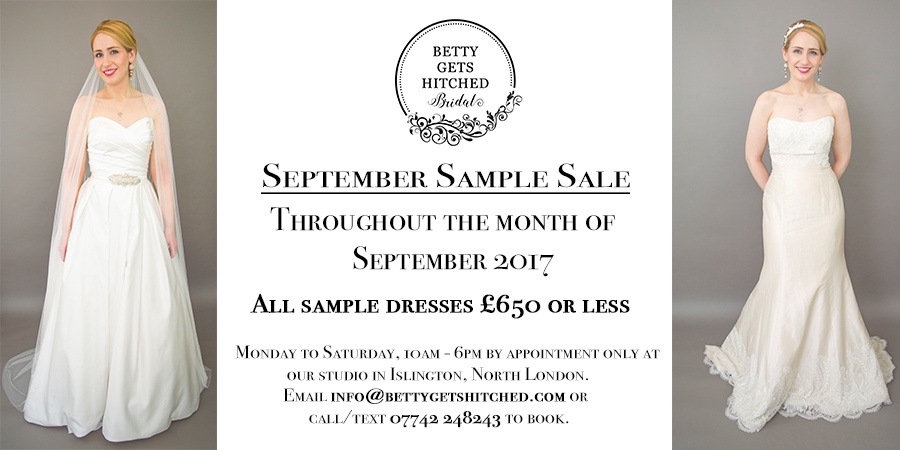 Sample sale throughout September 2017; all sample dresses £650 or less. By appointment only, please call/text or email to book.