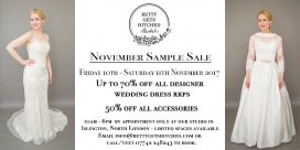 We are holding a sample sale by appointment only at our bridal studio in Islington, North London from the 10th to 11th of November. Up to 70% off wedding dress RRPs, and 50% off all accessories. This is our last sample sale of the year and we have limited spaces available; book now to secure your space! This is a great opportunity to find your dream wedding dress for less before the end of the year. Email info@bettygetshitched.com or call/text 07742 248243 to book.