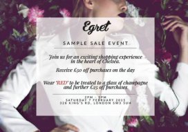Egret sample sale at Leggera Nell'Aria. Receive £50 off purchases on the day. Wear RED to be treated to a glass of champagne and further £25 off purchases.