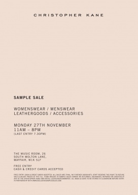 The Christopher Kane Sample Sale will feature womenswear, menswear, leather goods, and accessories at up to 90% off.