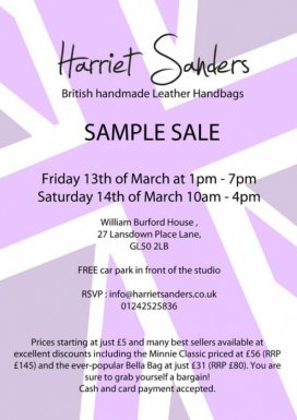 Sample sale of British handmade leather bags by Harriet Sanders. Prices starting at just £5 and many bestsellers available at excellent discounts including the Minnie Classic priced at £56 (RRP £145) and the Bella Bag at just £31 (RRP £80). Cash and card payment accepted. Free car park in front of the studio.