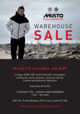 Outdoors brand MUSTO are having a warehouse sale. Massive savings on RRP. The sale includes GORE-TEX and Primaloft cold weather jackets also mens, womens, technical sailing, country and evolution collections. Sizes XS to XXL.